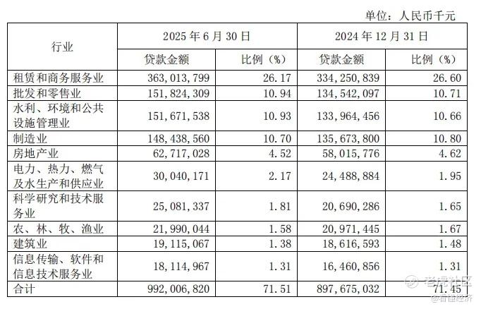 根据2025年半年报披露的贷款结构数据,租赁和商务服务业、批发和零售业、水利环境和公共设施管理业位居前三,占比分别为26.17%、10.94%和10.93%。而除了批发和零售,剩下的两项皆是政信类业务,合计占比37.1%。