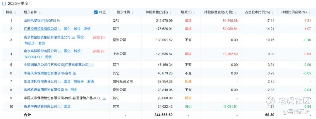 最后,强大的股东背景为南京银行的发展注入了强心剂。2025年前三季度,法国巴黎银行(QFII)增持5.43亿股,持股比例达17.14%;江苏交通控股增持5.2亿股,持股比例升至14.21%。这种双重加持,既稳固了股权结构,也为后续发展提供了强大背书。