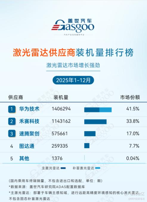而在2025年1-12月激光雷达供应商装机量排行榜中,**技术、禾赛科技和速腾聚创三家企业包揽前三名,合计占据了该市场超九成份额。