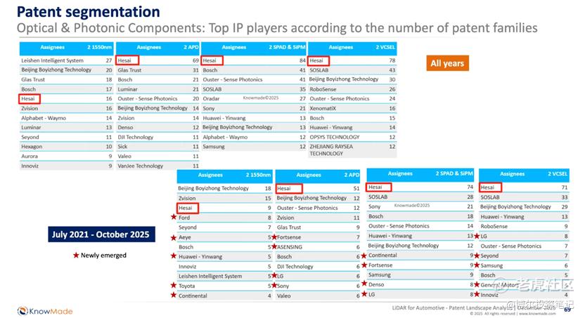知识产权分析机构KnowMade发布的《汽车激光雷达专利全景分析-2025版》显示,来自中国的禾赛科技,在激光雷达领域的专利数量与综合强度位居全球第一,与博世、Waymo 处于行业第一梯队。