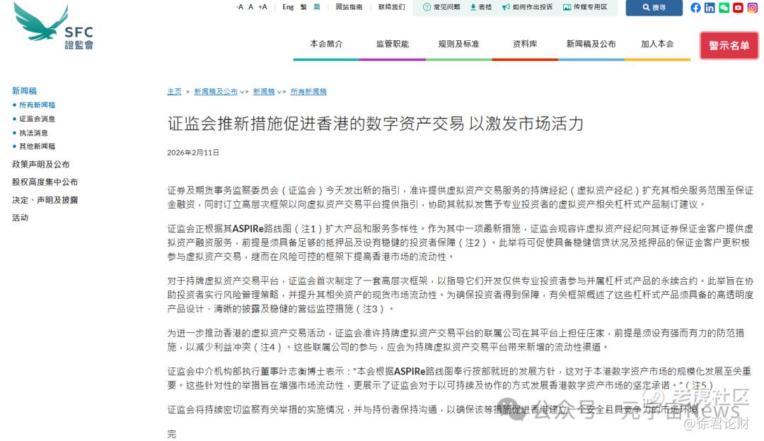 2 月 11 日,香港证监会发出新的指引,准许提供虚拟资产交易服务的持牌经纪(虚拟资产经纪)扩充其相关服务范围至保证金融资,同时订立高层次框架以向虚拟资产交易平台提供指引,协助其就拟发售予专业投资者的虚拟资产相关杠杆式产品制订建议。