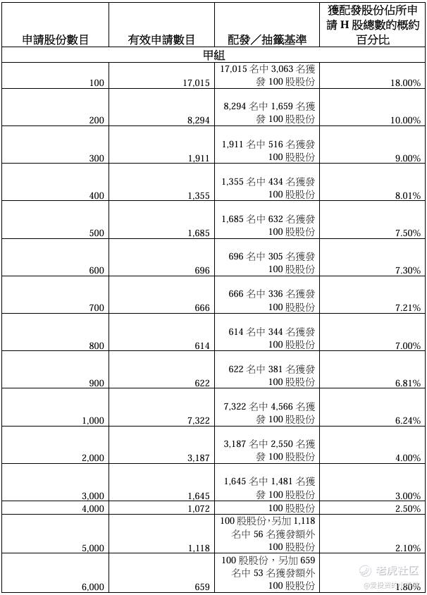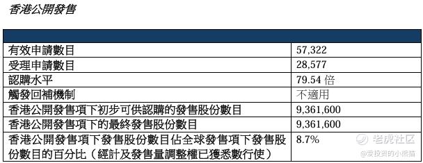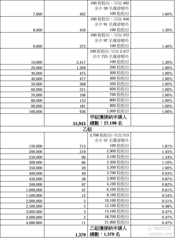 配售情况:57322人认购,这次公配79.54倍,由于机制B分配,无回拨比率,国配有10.47倍,一手中签率18.00%,认购40手稳中1手,同时乙组1379人申购,其中顶头槌申购11张,获配率0.47%-1.81%。