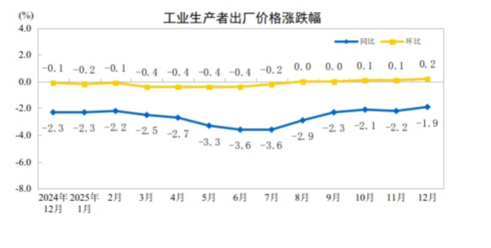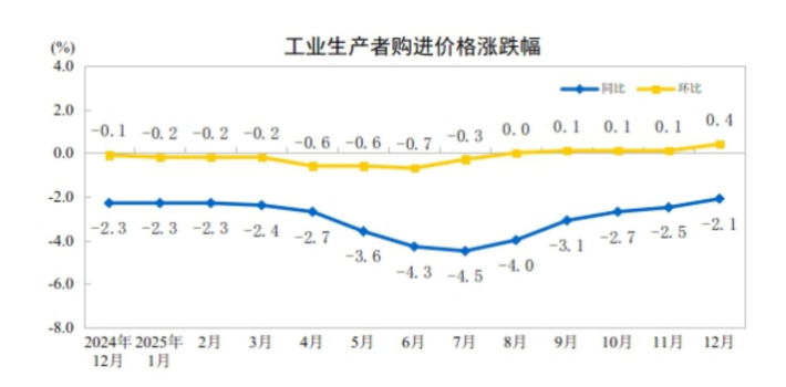 12月份,全国工业生产者出厂价格同比下降1.9%(前值下降2.2%),环比上涨0.2%(前值上涨0.1%);工业生产者购进价格同比下降2.1%,降幅较上月收窄0.4个百分点,环比上涨0.4%,涨幅比上月扩大0.3个百分点。2025全年,工业生产者出厂价格下降2.6%,工业生产者购进价格下降3.0%。