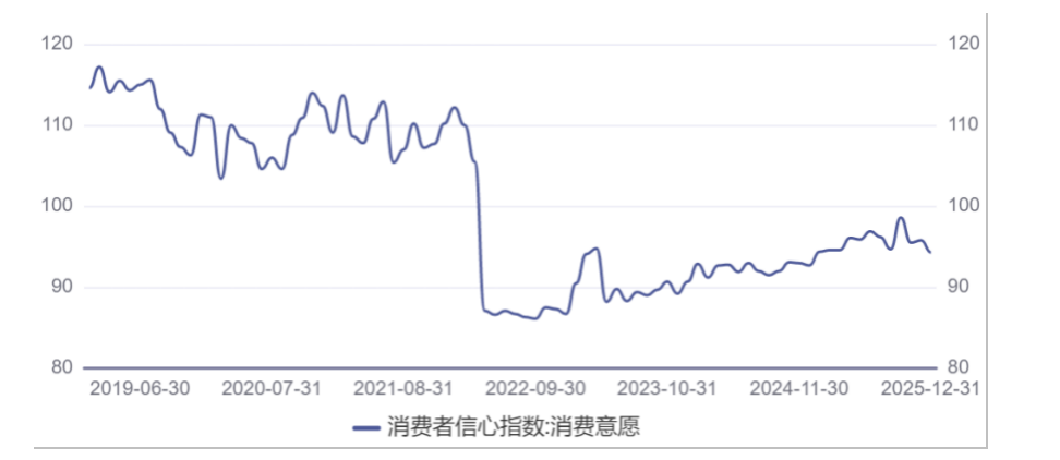 消费者信心指数(消费意愿)持续位于历史低位,2025年第四季度有所回落