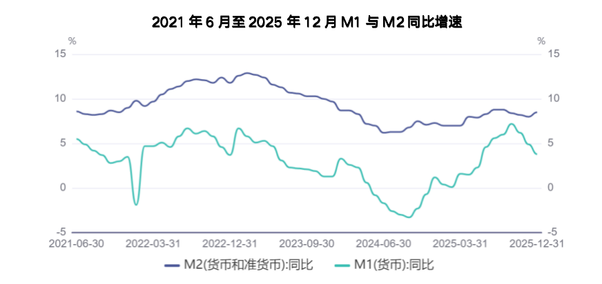 12月,M2同比增长8.5%,较11月上升0.5个pct;M1同比增长3.8%,较11月下降1.1个百分点;M0同比增长10.2%,较11月下降0.4个百分点。2025年12月活期存款(M1-M0)环比增长2.25%,定期存款(M2-M1)环比上升0.30%。M2与M1剪刀差继续扩大,表明虽然流动性整体充裕,但企业活期资金使用效率仍偏低,实体经济活跃度尚未显著恢复。