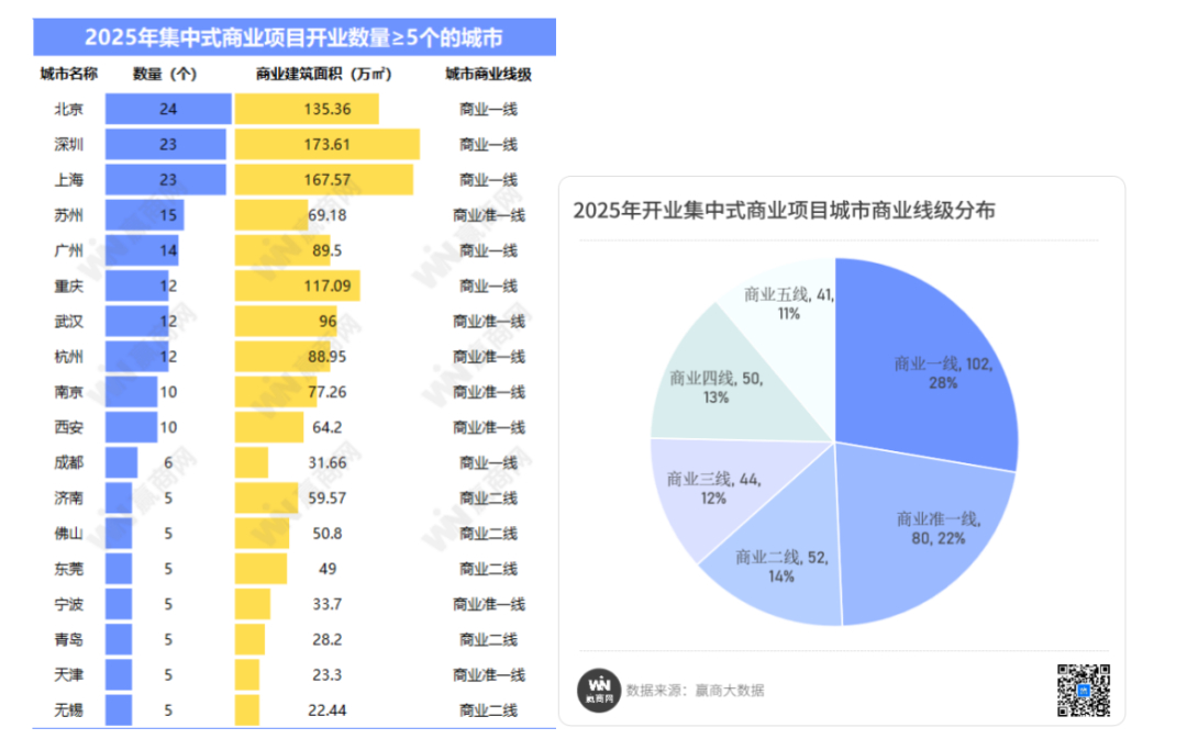 数据说明:1.统计范围为全国368个城市(不含港澳台)管辖行政区内,于2025年1-12月开业的集中式商业项目,项目类型包含购物中心、独立百货,不含商业街、文旅商业及其他类型;2.统计数据包含新建开业项目、存量改造开业项目、试营业项目;3.统计时间截止至2026年1月05日。4.城市商业线级是赢商大数据综合城市发展基础水平、商业发展规模、商业档次、商业人气及商业未来潜力等因素,对城市商业发展程度评估的等级性划分,共划分为六个等级。本文将商业一线、准一线、二线定义为高线级城市,商业三线、四线、五线城市定义为低线级城市。