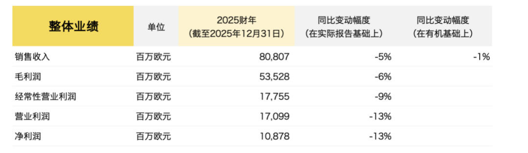 LVMH(路威酩轩)截至12月31日的2025财年业绩报告显示:全年总营收比上年下降5%至808亿欧元(在有机基础上:-1%);第四季度总营收在有机基础同比增长1%至227亿欧元,略高于市场预期,并延续了上一季度的回升势头。盈利方面,经常性经营利润同比下降9%至178亿欧元,经营利润率为 22%,汇率波动造成显著负面影响(约10亿欧元)。