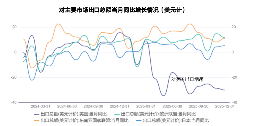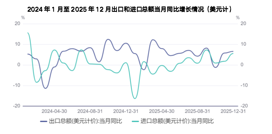按美元计,12月份,我国出口同比增长6.6%(前值增长5.9%),进口同比增长5.7%(前值增长1.9%)。从主要出口市场看,12月份,对东盟出口同比增长11.2%,延续高增长趋势;对欧盟出口增长11.6%;对美国出口同比下降30%,降幅持续扩大。展望2026年,出口增速大概率保持在中、低个位数水平,中美贸易形势难有显著改善。