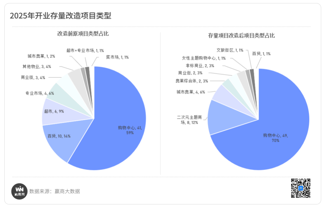 存量改造商业项目占比保持在20%以上,2025年新开业项目中70余个存量改造项目。其中,购物中心升级改造项目41个,占比近六成,其次是百货、超市物业改造。而二次元主题商场、城市奥莱、非标商业成为老商场改造的“新出路”。