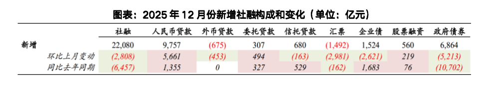 从社融存量结构来看,2025年12月与11月相比,占比上升的主要是政府债券(上升0.05个pct),此外是信托贷款融资占比小幅上升0.01个pct,占比下降较多的是人民币贷款(下降0.06个pct)、汇票(下降0.04个pct)和外币贷款(下降0.02个pct)。