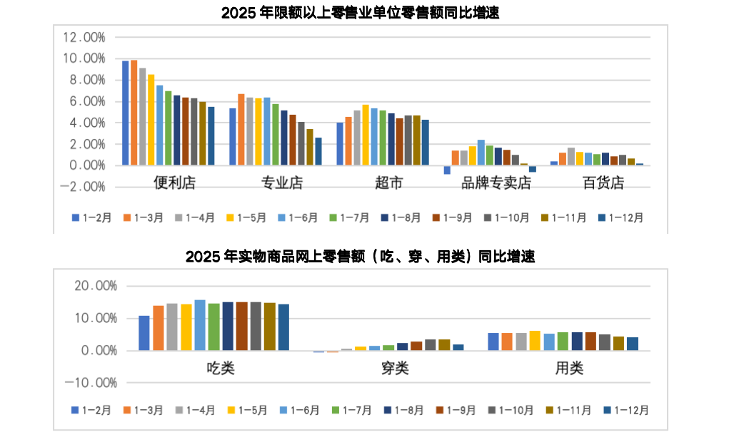2025年,全国网上零售额同比增长8.6%。其中,实物商品网上零售额增长5.2%,占社会消费品零售总额的比重为26.1%;在实物商品网上零售额中,吃类、穿类、用类商品分别增长14.5%、1.9%、4.1%。