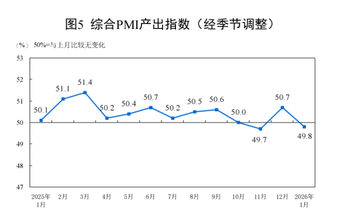 1月份综合PMI产出指数回落至49.8%,比同期低0.3个百分点