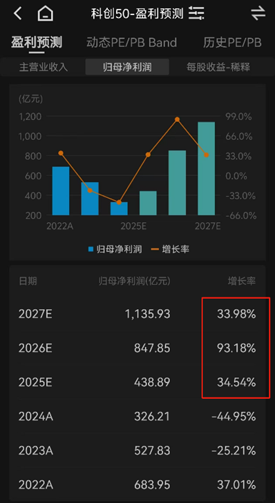 以科创50为例,市场预期2025年利润增速是35%,2026年接近93%,这说明,翻倍的业绩预期,其实才是估值的重要支撑。