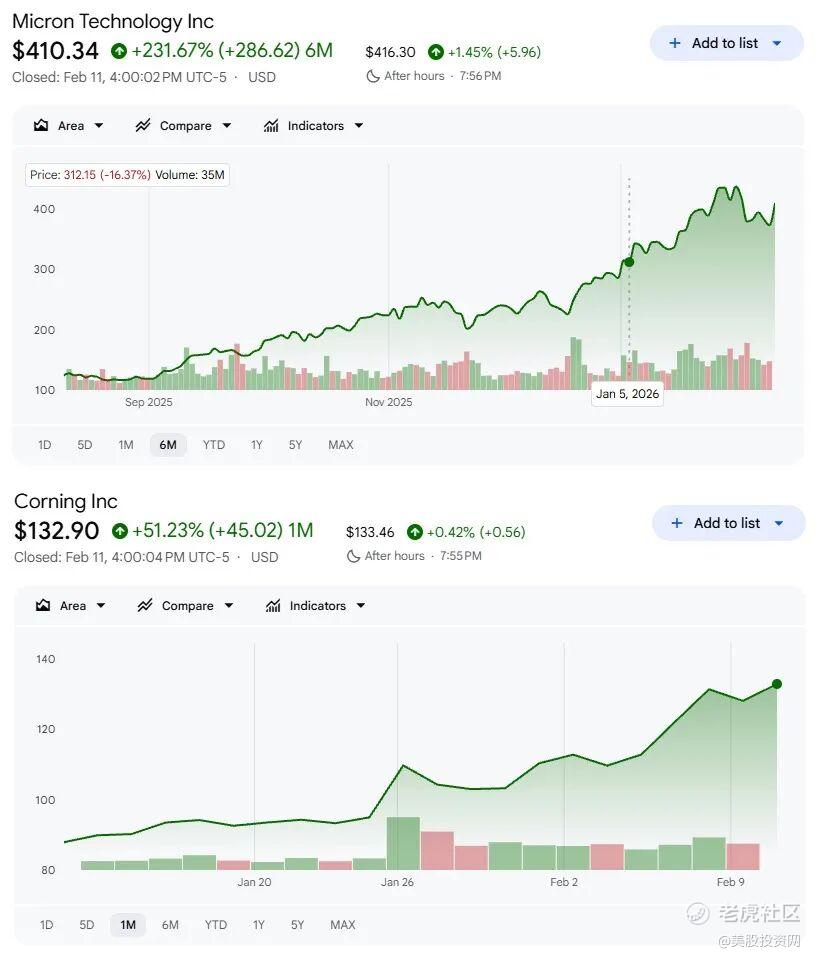 作为美股投资网 2026必买10股之一的 MU,从发布文章和视频到现在已经上涨25%,AI材料应用股 GLW 涨了 50%, 当你买对股票之后,能抵抗熊市的冲击。强者恒强!