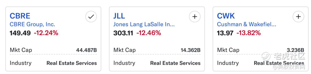 周三美股盘中,商业房地产服务板块遭遇异常剧烈抛售。以CBRE集团( $世邦魏理仕(CBRE)$ ) 和 仲量联行(Jones Lang LaSalle, JLL) 为首的龙头股价均下跌约 12% 左右,Cushman & Wakefield(CWK) 更是重挫约 14%,其中 CBRE 和 Cushman 的单日跌幅创下自 2020年疫情暴跌以来最大纪录。