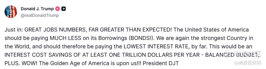 数据公布后,美国总统特朗普在社交平台发文称,“就业数据大好,远超预期!美国应在借贷成本(债券!)上支付少得多的利息!我们再次成为世界头号强国,因此理应享有迄今为止最低的利率。这将带来每年至少一万亿美元的利息支出节省——预算不仅能平衡,还能大幅盈余。哇!美国的黄金时代已至!!!”