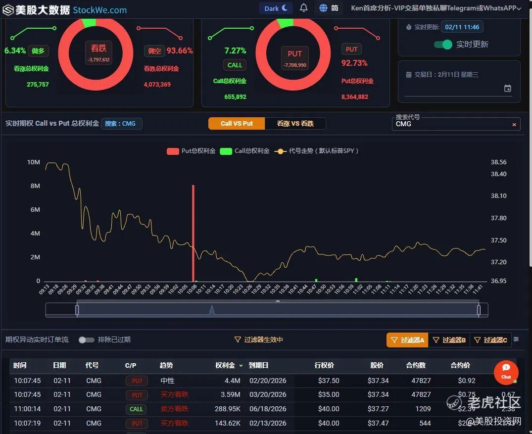 解读:【美股期权异动】交易时间 2026-02-11 11:07:45 CMG 到期日 2026-02-20 Put 中间价附近 总价值 440万美元,行权价37.50 成交量47827 竞价0.92 未平仓合约53640 隐含波动率36.60