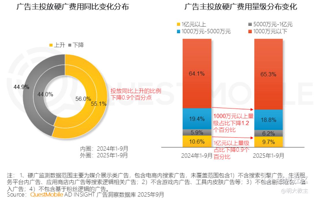 市场结构的变化也印证了这一趋势。QuestMobile数据显示,2025年投放亿元以上硬广的广告主占比下降0.9个百分点,千万级以上硬广的广告主占比下降1.2个百分点。与之相对,国内互联网广告市场整体仍保持增长——这说明预算正从“品牌曝光”向“效果转化”迁移。