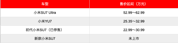 初代小米SU7已经停售,新款小米SU7要等到第二季度才会上市,小米目前的走量车仅有一款小米YU7;数据来源:易车网