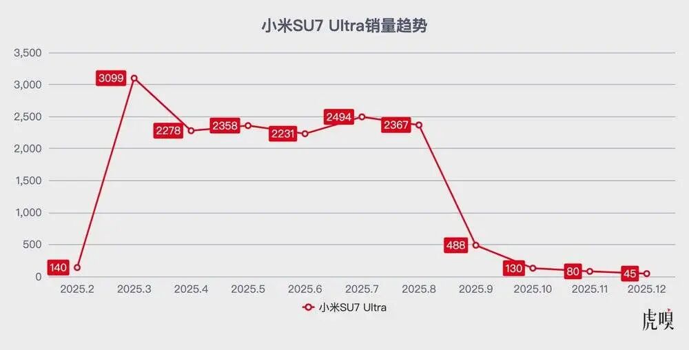 从2025年9月起,小米SU7 Ultra月销量暴跌,直至去年12月份,从最高峰月销三千多辆,下滑到月销只有45辆。