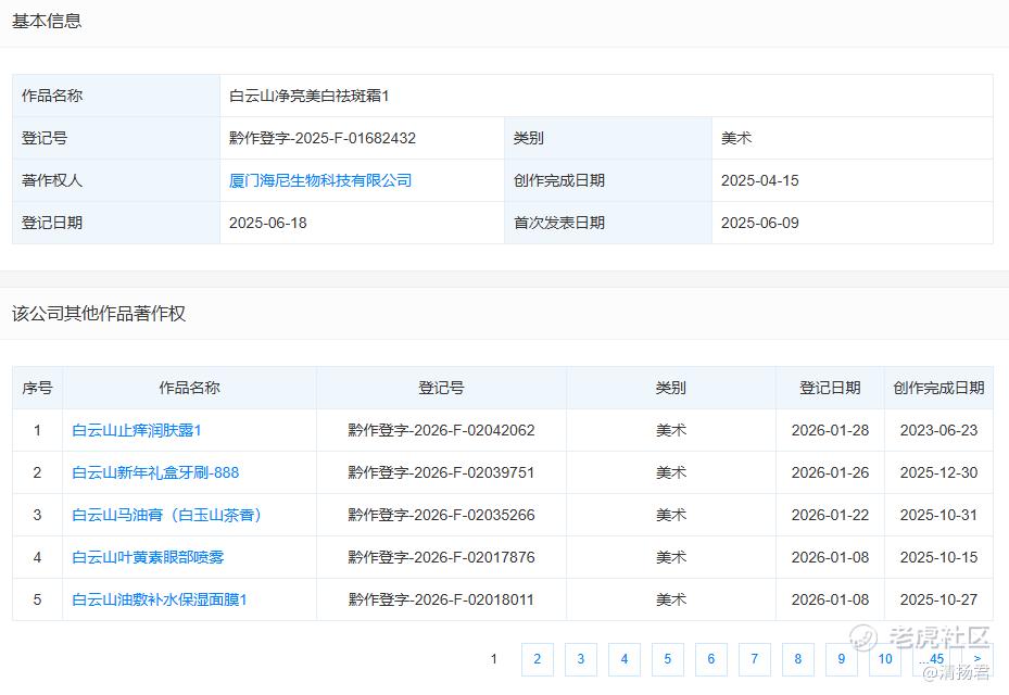 需要说明的是,“白云山净亮美白祛斑霜”的注册人系美颂化妆品持股90%的控股子公司。而福建帮的知名代表企业——厦门海尼生物科技有限公司,不仅曾就该产品名称备案了作品著作权(登记号:黔作登字-2025-F-01682432),还陆续登记了包括“白云山新年礼盒牙刷-888”“白云山马油膏”“白云山叶黄素眼部喷雾”“白云山油敷补水保湿面膜1”等在内的多项“白云山”相关作品著作权。