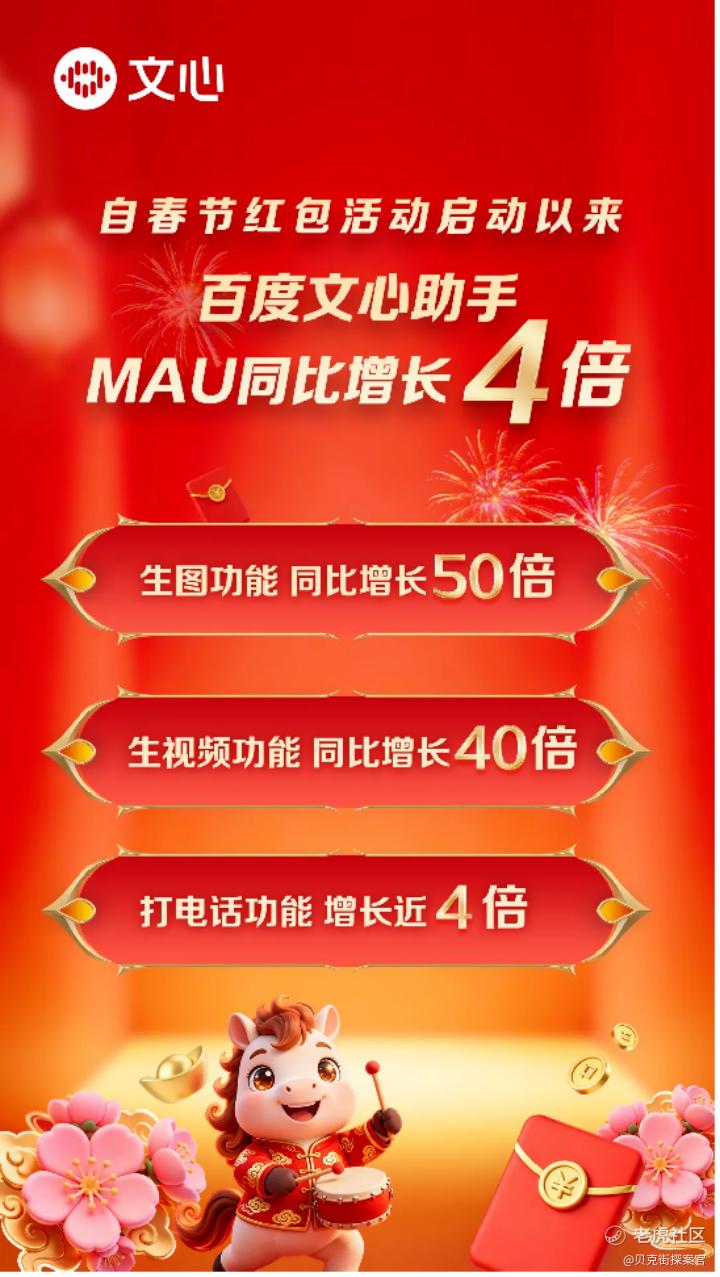 2月10日,百度文心公布数据:自春节红包活动启动以来,文心助手MAU同比增长4倍;其中,生图功能调用量同比增长50倍,生视频功能同比增长40倍,AI打电话功能增长近4倍。多项核心能力的同步爆发,意味着用户使用正从节日驱动的尝鲜体验,转向高频、真实场景下的持续使用。