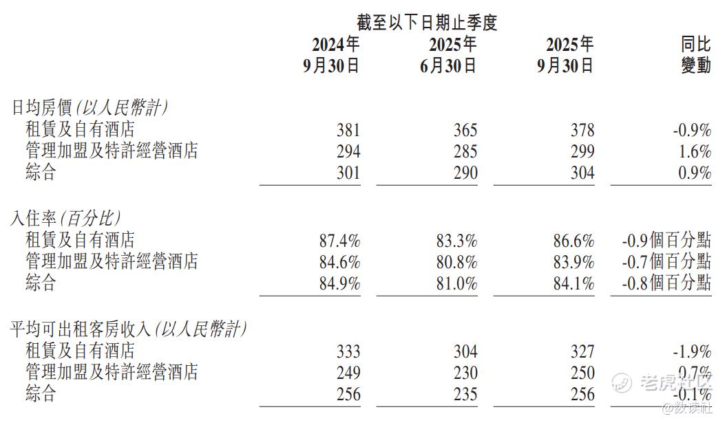 2025年前三季度,华住集团自有酒店的日均房价为378元,加盟酒店仅为299元;自有酒店入住率为86.6%,加盟酒店为83.9%;自有酒店平均可出租客房收入为327元,加盟酒店仅为250元。