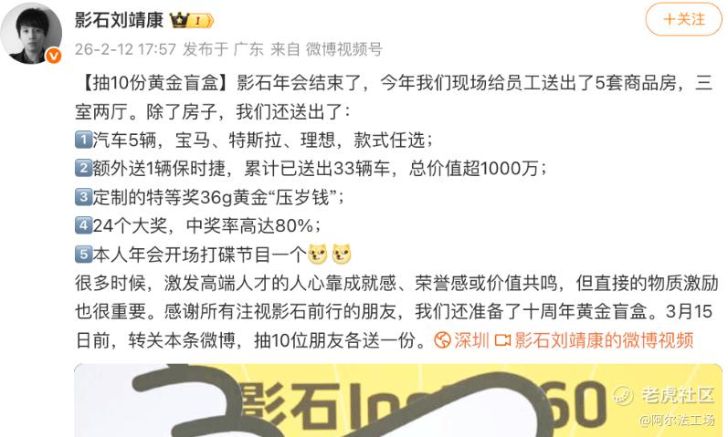 简直“壕无人性”!“ $影石创新(688775)$ 年会送房送车送黄金”刷屏后,影石CEO刘靖康在次日(2月12日)下午再发“壕言”,除了送出5套三室两厅商品房(!!!),公司还送出了: