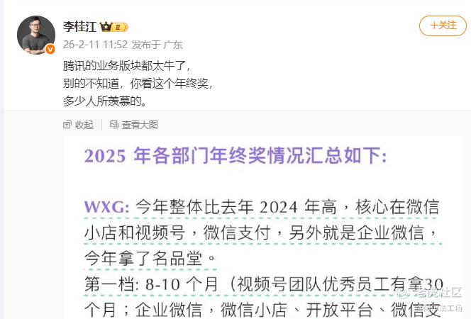 部分业内人士晒出的消息更刺激,比如逐鹿网创始人以及知名大V李桂江都在个人微博上转发了“2025年腾讯各部门年终奖”的截图,其中显示腾讯视频号团队优秀员工最高可拿到30个月工资奖励,而游戏业务条线的年终奖第一档在12个月工资左右。