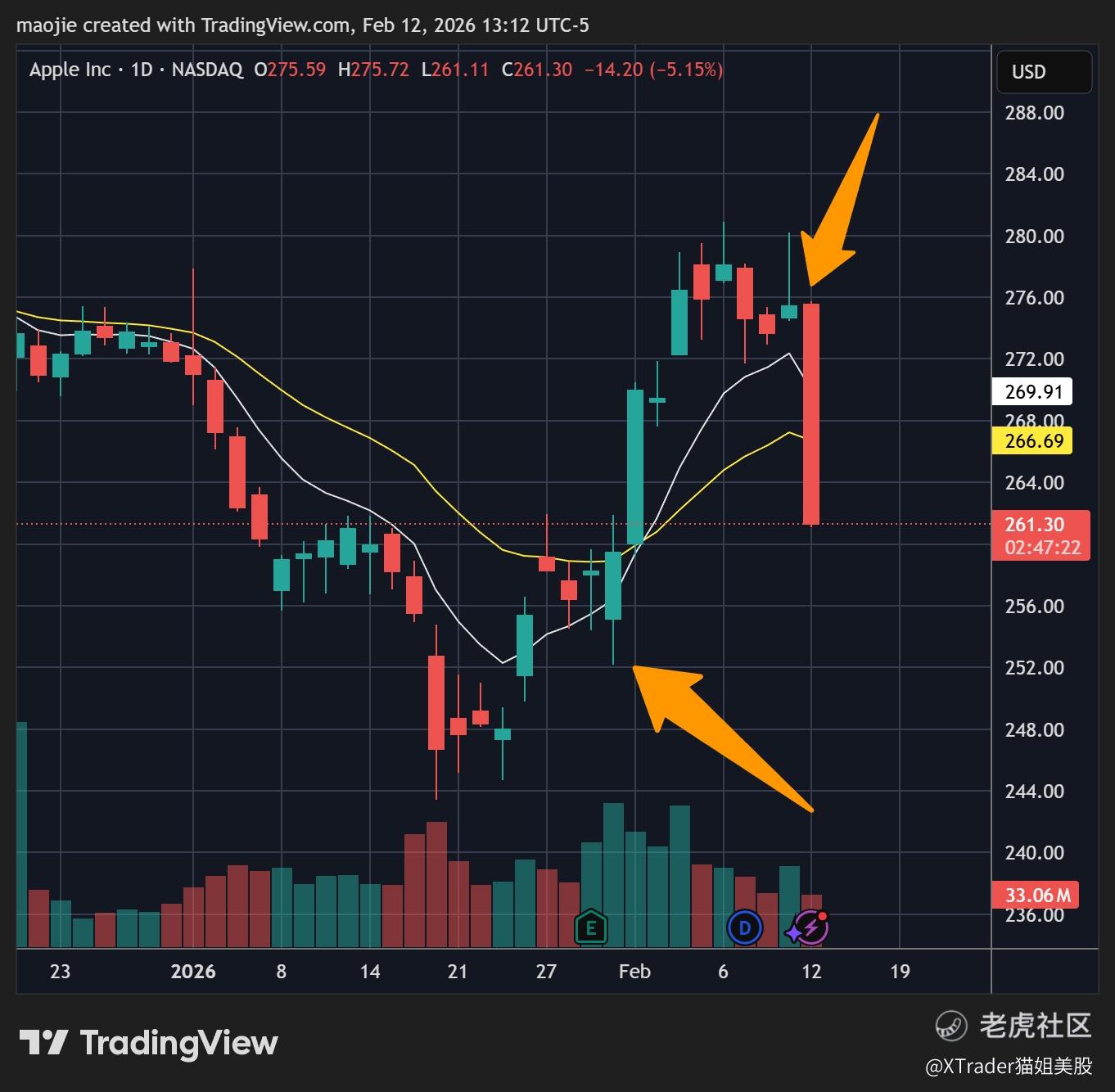 $AAPL 1/30这根k是漂亮的反转蓄势,当时要做多的,趋势延续的话要去新高的,之后的走势也交代了这一情况。但今天出现反转,一天打破趋势。