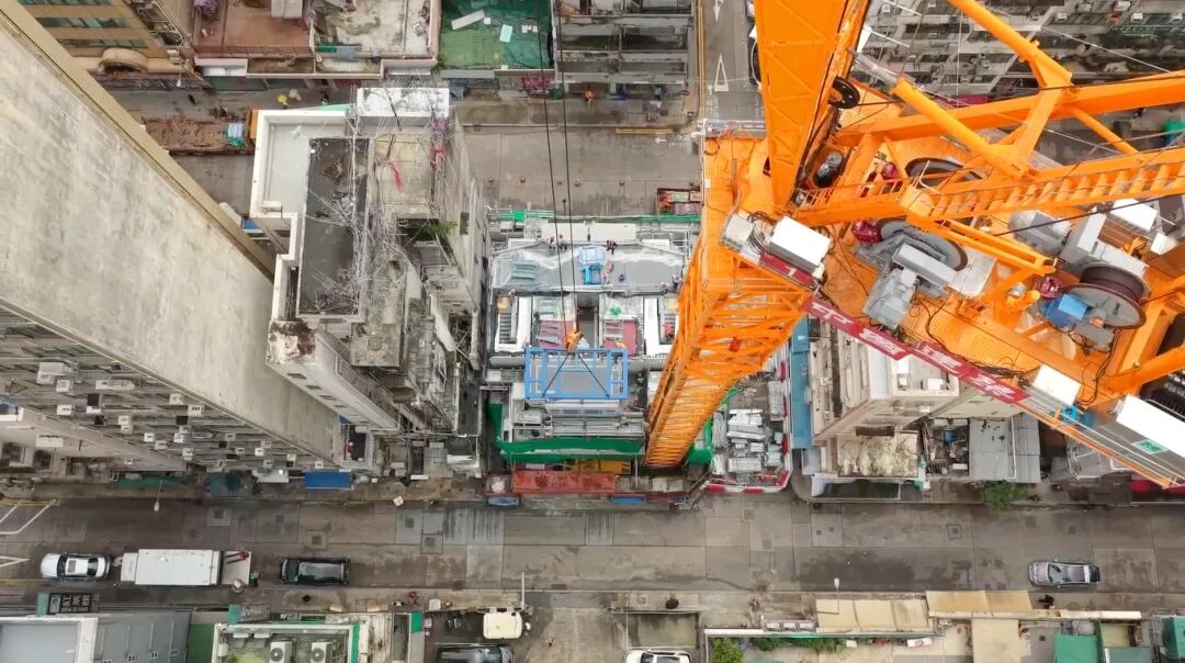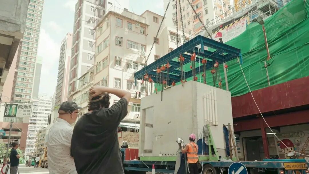 该项目占地面积约209.4平方米,主体建筑与毗邻大厦距离仅0.9米,且紧邻一座有161年历史的天后庙,施工空间十分有限,难以使用大型机械。为此,项目特别采用定制的塔吊,最大起重量达50吨,可吊装约39吨的MiC模块,并配合实时追踪与运输调度,提升物流效率。截至目前,共完成143件MiC模块的市区运输与现场吊装,未对周边交通及商业活动造成影响。