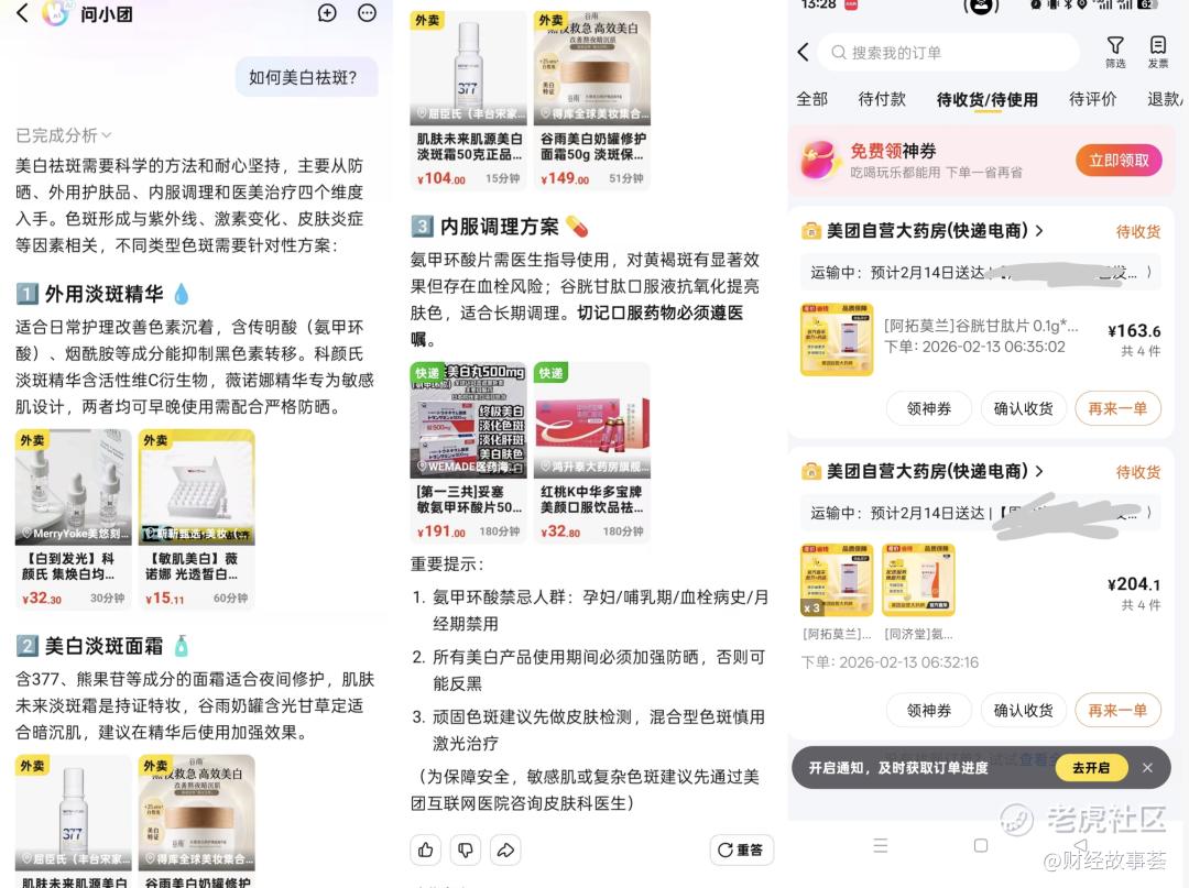 除了年夜饭之外,我们尝试向小团请教如何“美白祛斑”。小团直接给出了三条建议——外用淡斑精华、美白淡斑面霜、内服调理方案。同时,精准推荐了平台商家,且给出送货上门的时间——30分钟到50分钟上门。既帮用户省去了大量查询时间,又能直给精准的消费指引。