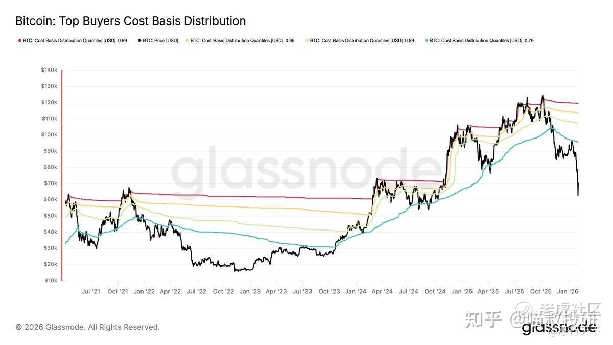 自2025年10月的ATH以来,价格未能跨过供应顶端1%、5%、10%和20%的成本基准。在6万美元时,价格比顶端20%的成本基准差~37%(~9.5万美元),显示出对顶级买家的巨大心理压力,这一状况与2022年5月的情况相当。