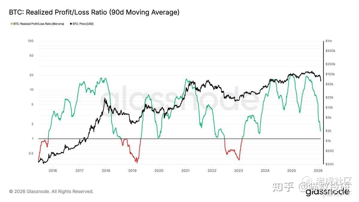 尽管在2025年10月初出现了第二个ATH,但实现盈亏比(90D-SMA)自2025年7月底以来一直在下降。现在数据已经降到了~1.45,标志着市场盈利能力的急剧恶化,尽管仍高于历史上极端投降时的<1水平,如果后面再跌到<1了,果断加大仓位抄底即可。