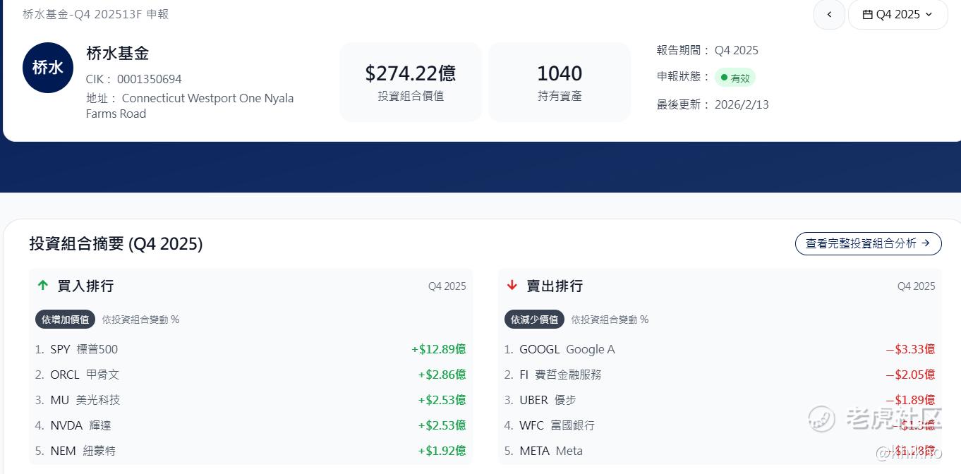 桥水的作业出来了,他们2025 年第四季度,桥水基金Bridgewater Associates的13F报告市值为274.22亿,环比增长了7.42%。他们这次披露的持仓数量达1040 只(较上季新加了26只)。前十大持仓集中度为 36.33%。就前十权重构成来看, $标普500ETF(SPY)$ 与 $标普500ETF-iShares(IVV)$ 这两只宽基指数 ETF 合计约21.5%的权重,成为驱动组合Beta的核心底座。同时, $英伟达(NVDA)$ ,拉姆研究(LRCX)、赛富时(CRM),Alphabet A(GOOGL),微软(MSFT),亚马逊(AMZN) 和 奥多比(ADBE)等科技与企业软件龙头位居其后,GE Vernova(GEV) 以能源/电力转型主题,也进入了前十。他们这整体风格体现出指数化, AI算力为主线,龙头软件的多因子框架,既把握宏观趋势,又拥抱科技成长的结构性贝塔。