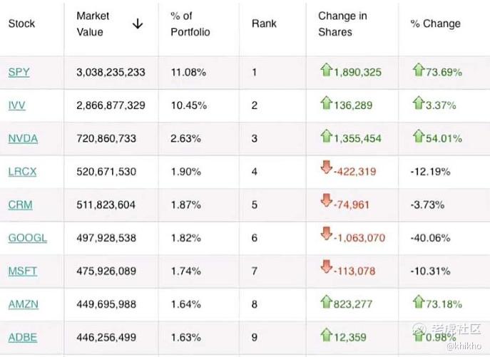 以下是按占投资组合由高到低梳理,他们的第一大持仓是SPY标普 500ETF,权重高达11.08%。这个季度还增加了73.69%,股数为445.54 万,市值30.38亿。这显示出他们在Q4 对宽基美股 Beta 的显著加码,极大提升了组合与美股大盘的相关性,也为后续自上而下的宏观配置提供稳定的敞口枢纽。在波动加剧或流动性收紧时,SPY 的可交易性与成本效率更具优势。