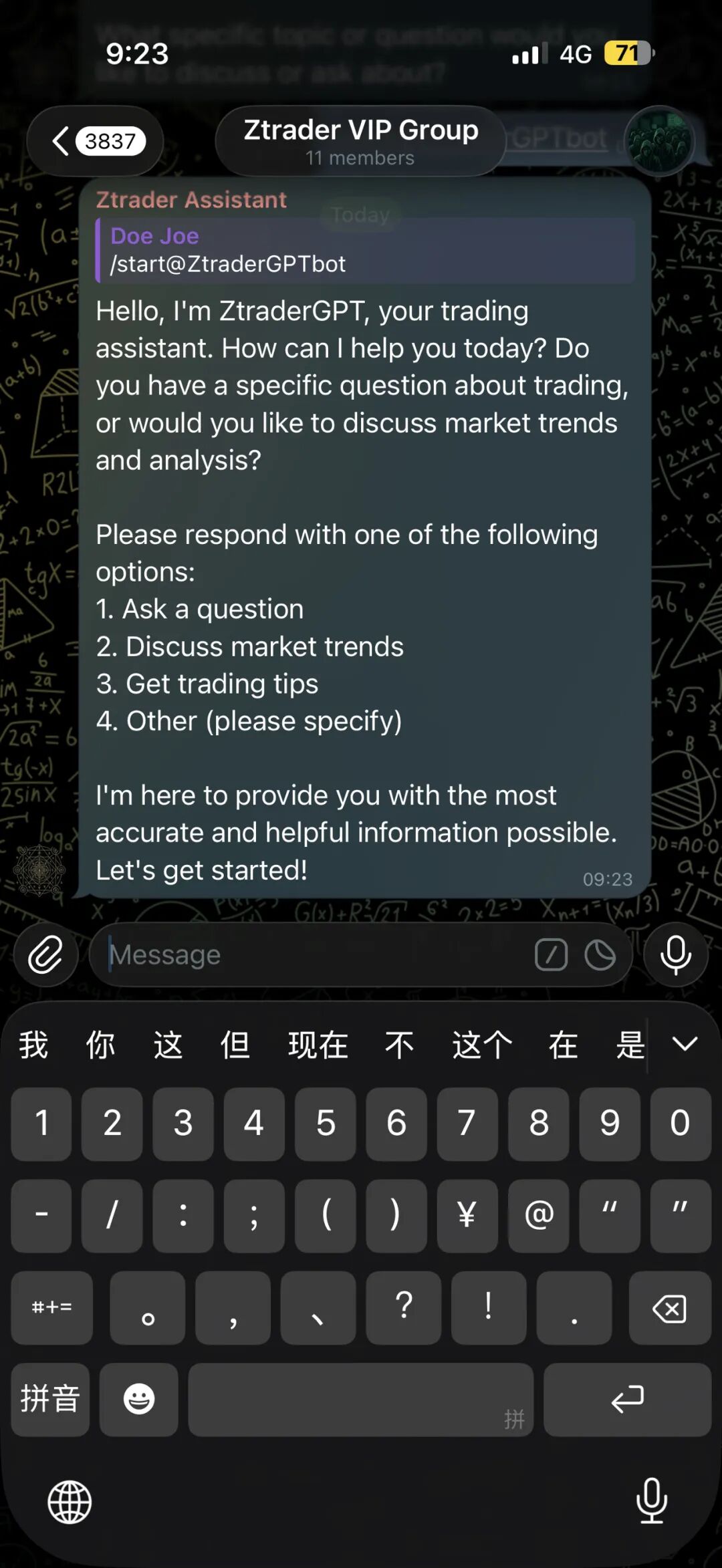 3. 打通RAG系统,复用所有的文章/数据,代码资产。如同上图,现阶段的telebot我还没有加载爬虫/agent flow/联网搜索/RAG读取,所以实际上调用的是未经过特化的LLM 模型,我现在的框架是,每天更新的文章/信息流(Z星球)的交易干货在RAG系统里沉淀,记忆,然后让我的telegram bot sync,最后自定义好bot的行为之后,甚至可以调取agent,sync 我的工作流(比如说diff修复bug,或者是例行的pm2维护,自定义的安全扫描脚本等大量重复性的工作,直接通过cron 每天清晨通过bot发给我每日的工作状态简报,比如说用户数据/交易策略Pnl/pm2 log或者是服务器的关键组件功能是否健全/每日的交易数据,最新的Arxiv文章摘要等等,都会定时定量出现在我的对话框。