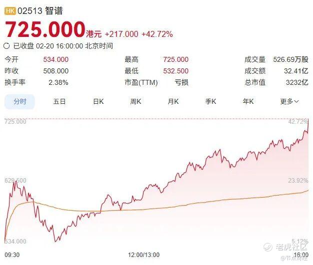2026年马年初五(2月21日),港股开市首日,中国AI企业用一场震撼的市值狂飙,完成了一场属于科技行业的“硬核迎财神”——智谱单日暴涨42.72%,收盘报725港元,市值突破3232亿港元;MiniMax同步发力,收涨14.52%,报970港元,市值冲破3042亿港元。