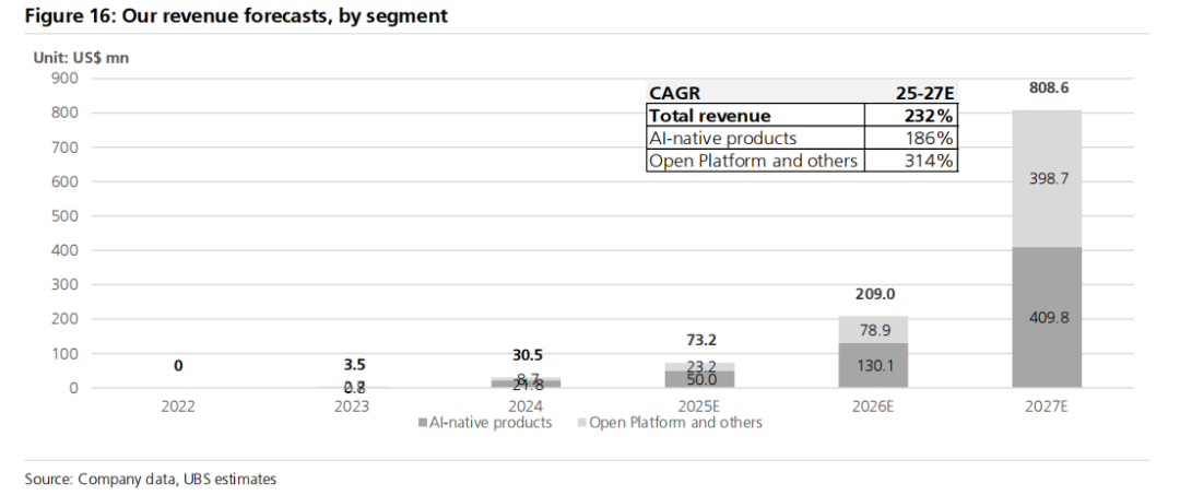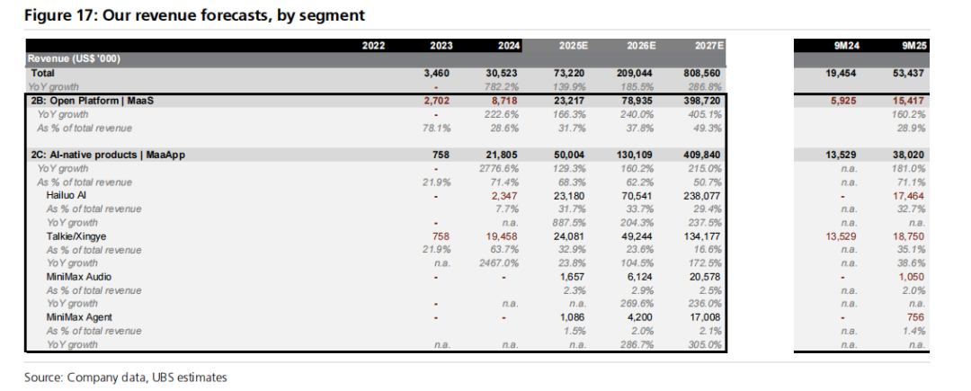 我们预期 MiniMax 在 2025-27 年实现强劲收入增长,复合年增长率达 232%,2025/26/27 年收入分别达到 7300 万/2.09 亿/8.09 亿美元,由持续的模型智能升级和商业产品扩张驱动。我们相信强劲收入增长将由 AI 原生应用的快速用户扩张和改善的货币化,以及 MiniMax 文本和多模态模型在高价值用例(如编码和内容创作)中 gaining share 推动的 API 采用加速所驱动。在收入构成中,我们预期开放平台(2B)业务和海螺 AI(2C)业务有更强的货币化潜力,并预期这两个板块合计占 2025/26/27 年总收入的 63%/72%/79%。