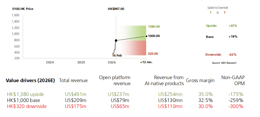 我们对 MiniMax 给予买入评级,目标价 1000 港元。MiniMax 是首批上市的基础模型公司之一,专注于构建专有和前沿 AI 模型,为消费者 AI 原生应用和企业/开发者的开放平台提供支持。我们对加速基础模型行业商业化前景和 MiniMax 持乐观态度,支撑因素是持续的模型迭代和产品创新。我们注意到全球企业市场 AI 货币化势头增强,以及 MiniMax 在快速发展的企业/代理产品(如 Claude Code、OpenClaw)中日益增长的存在,利用其成本性能优势。尽管估值溢价,但我们看到显著的增长上行空间,这可能消化 MiniMax 的估值倍数,因收入规模化实现。
