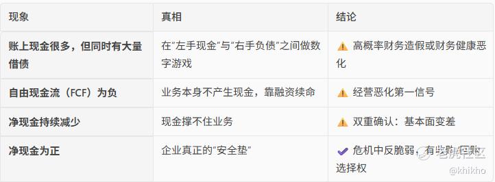 这个简单的公式能戳破绝大多数财务魔术,如果一家公司账上有大量现金却同时背负高额有息负债,这是财务造假的高频特征。要小心了。自由现金流为负,加上净现金减少,这是基本面恶化的双重确认。利润可以调节,但净现金的持续减少难以掩盖。净现金为正的公司在危机中拥有反脆弱性。当行业下行时,它们可以逆势收购,当流动性收紧时,它们可以回购股票,这种选择权本身就有价值。