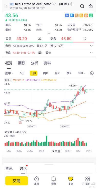 第三只是 $Real Estate Select Sector SPDR Fund(XLRE)$ 专注于标普 500 指数中的大型房地产公司。截至 2026年2月,XLRE的AUM约为76亿美元,股息率约 3.35%。贪图稳定的朋友应该都喜欢这只ETF,因为他最聚焦,虽然仅有31只持仓,但是这些持仓全部来自标普500,安稳的很,而且他们也提供pure-play的大型房地产股exposure。