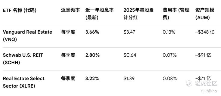 根据2026年初的最新市场数据(借助AI总结的[鬼脸]),这三只最大的房地产REITs ETF在分红频率,股息率及成本方面的对比如下: