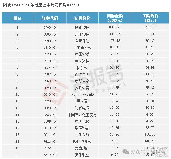 2025年,腾讯控股以800亿港元规模继续稳坐港股“回购王”。汇丰控股、友邦保险分列其后,分别回购了303亿、177亿港元。