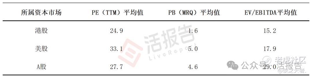 A股PE(TTM)平均值27.7倍、PB(MRQ)平均值4.6倍、EV/EBITDA平均值29.0倍。