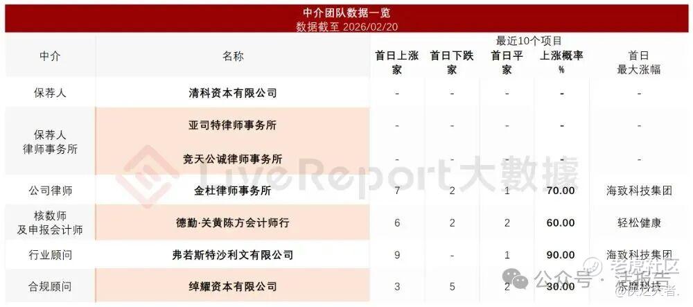 据**大数据统计,德兰明海中介团队共计7家,其中保荐人1家;公司律师共计1家,综合项目数据表现尚可。整体而言中介团队历史数据表现中规中矩。