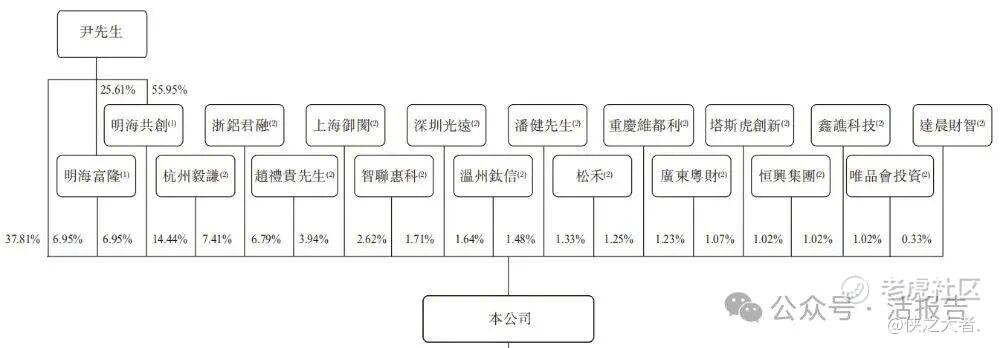 尹相柱先生直接持股约37.81%,并通过雇员激励平台明海富隆和明海共创分别间接持股约6.95%、6.95%,合计持股约51.70%。