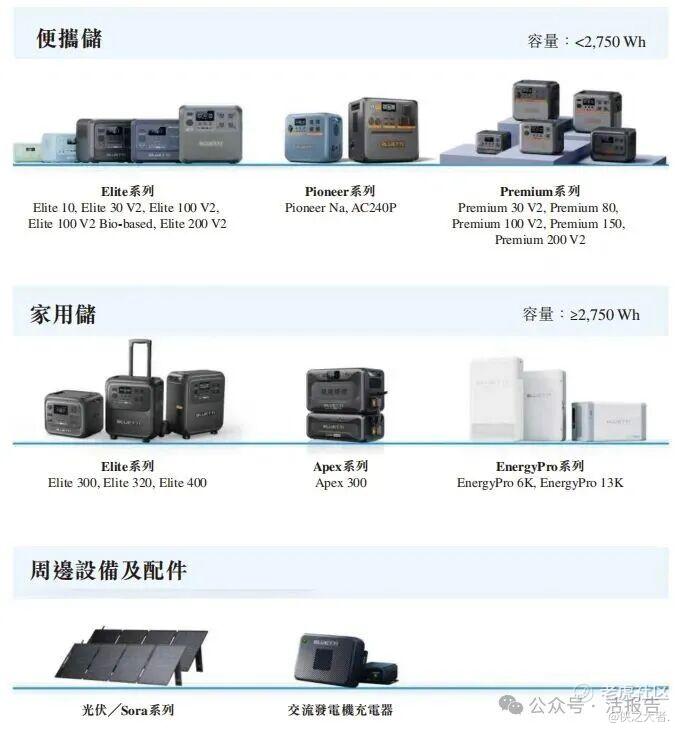 公司的分级产品组合涵盖便携式储能产品与家用储能产品,并辅以周边设备及配件生态系统。核心系列包含Elite、Pioneer、Premium、Apex及EnergyPro,同时提供太阳能板与交流发电机充电器等生态系统周边设备。
