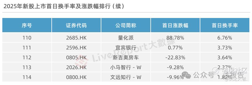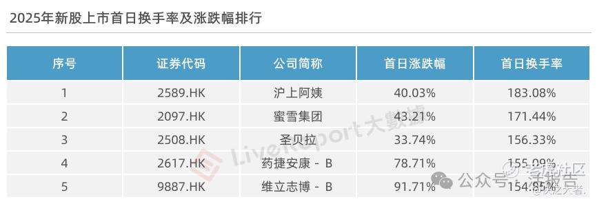 换手率方面,2025年按上市首日实际可流通港股股本计,114家新股的上市首日换手率平均值约为58.01%。