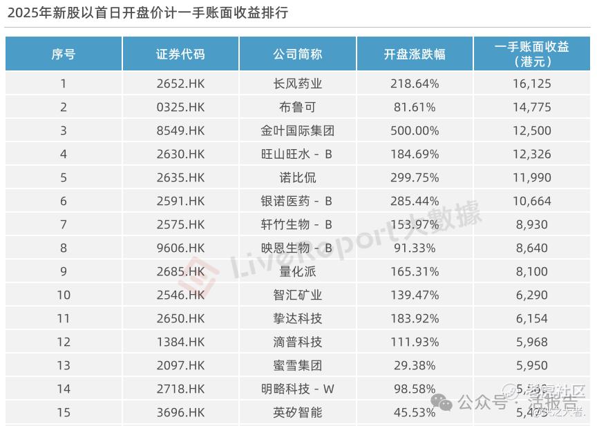 以上市首日开盘价计,在未计手续费的情况下,假设每只新股中一手,投资者全年所有新股的一手账面收益达到22.33万港元。一手账面收益超过5000港元的新股有17只,其中排名前六的公司分别为长风药业、布鲁可、金叶国际集团、旺山旺水-B、诺比侃 、银诺医药-B,一手收益均超万元。